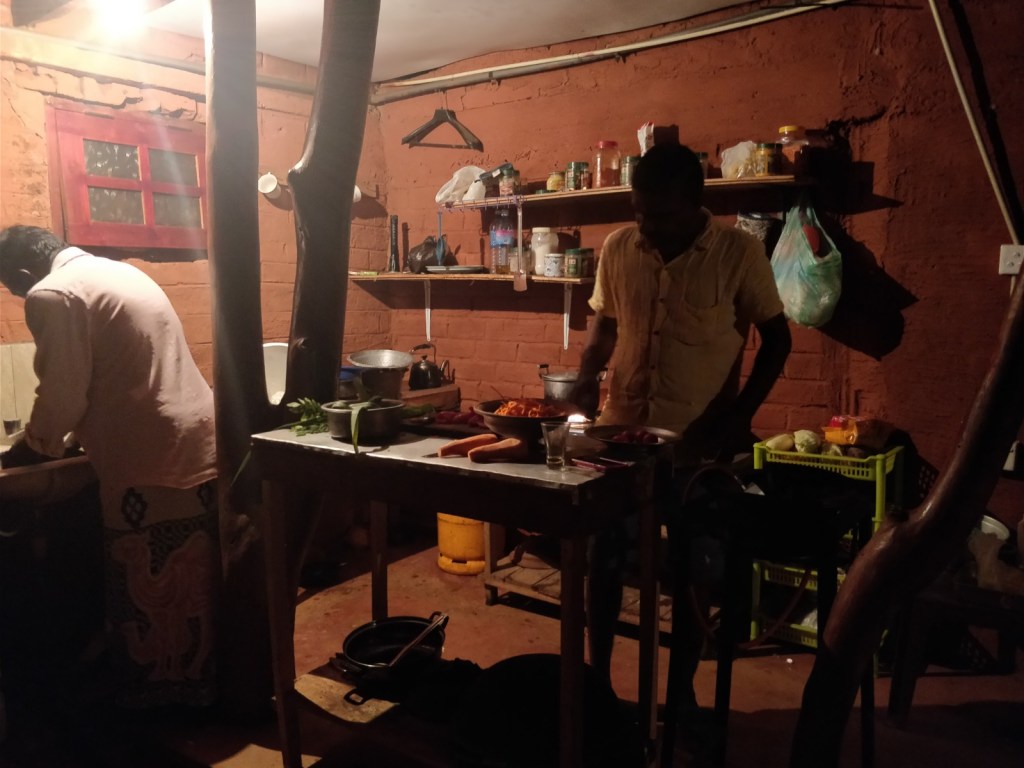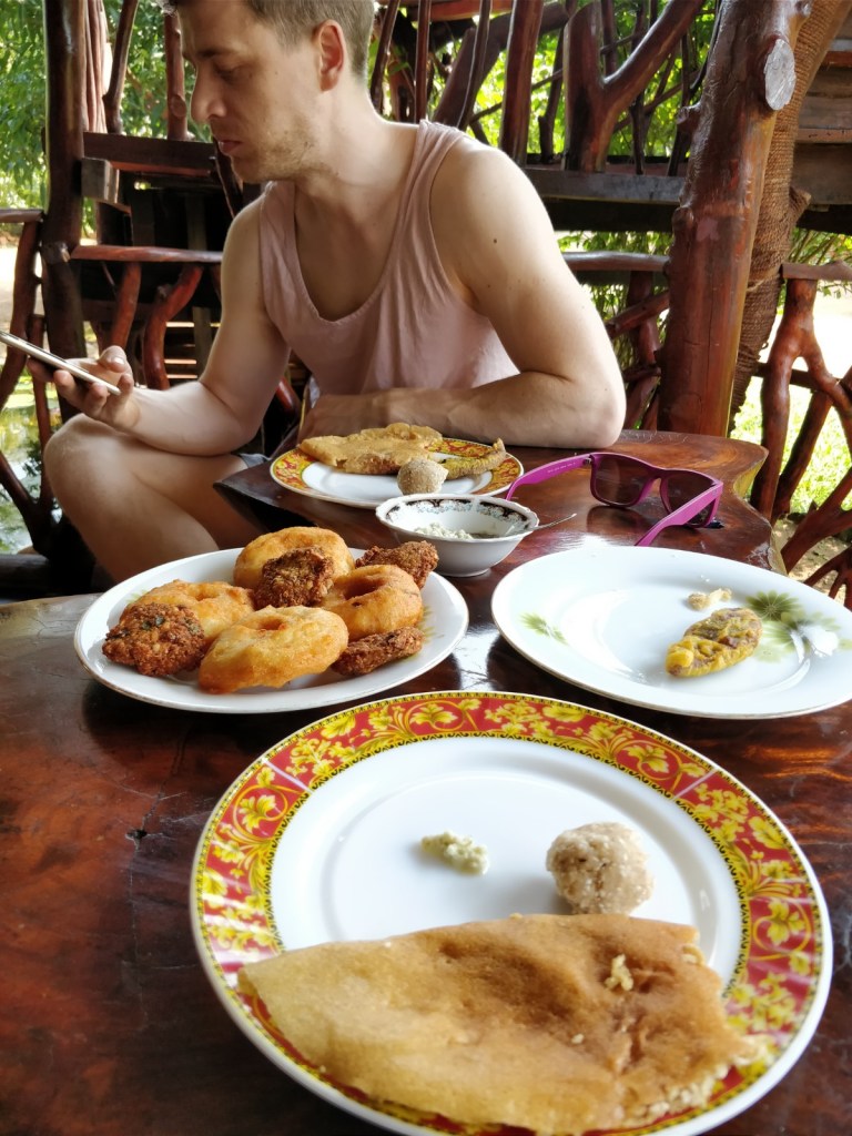 After getting lost a little, we finally made it to our guest house to meet the owner Nera. Nera was a great guy. Over our stay there he told us his story where he used to be a humble tuk tuk driver. Then about 6 years ago he opened a fruit stall with his wife, which gradually became a juice shop, then a restaurant. Ahinsa restaurant in Sigiriya (named after his daughter) is now number 1 on trip advisor, and so, with that success he has recently opened a small guest house. The house is built around a tree (the same as his restaurant) and is named after his son, Anushka. The treehouse was beautiful, right in nature with everything hand crafted (he showed us the pics of him doing it!). He was also a great cook and I don’t think we felt hungry once during our stay!! He piled the food high on our plates! He also fed us shots of Arrack, a coconut rum!