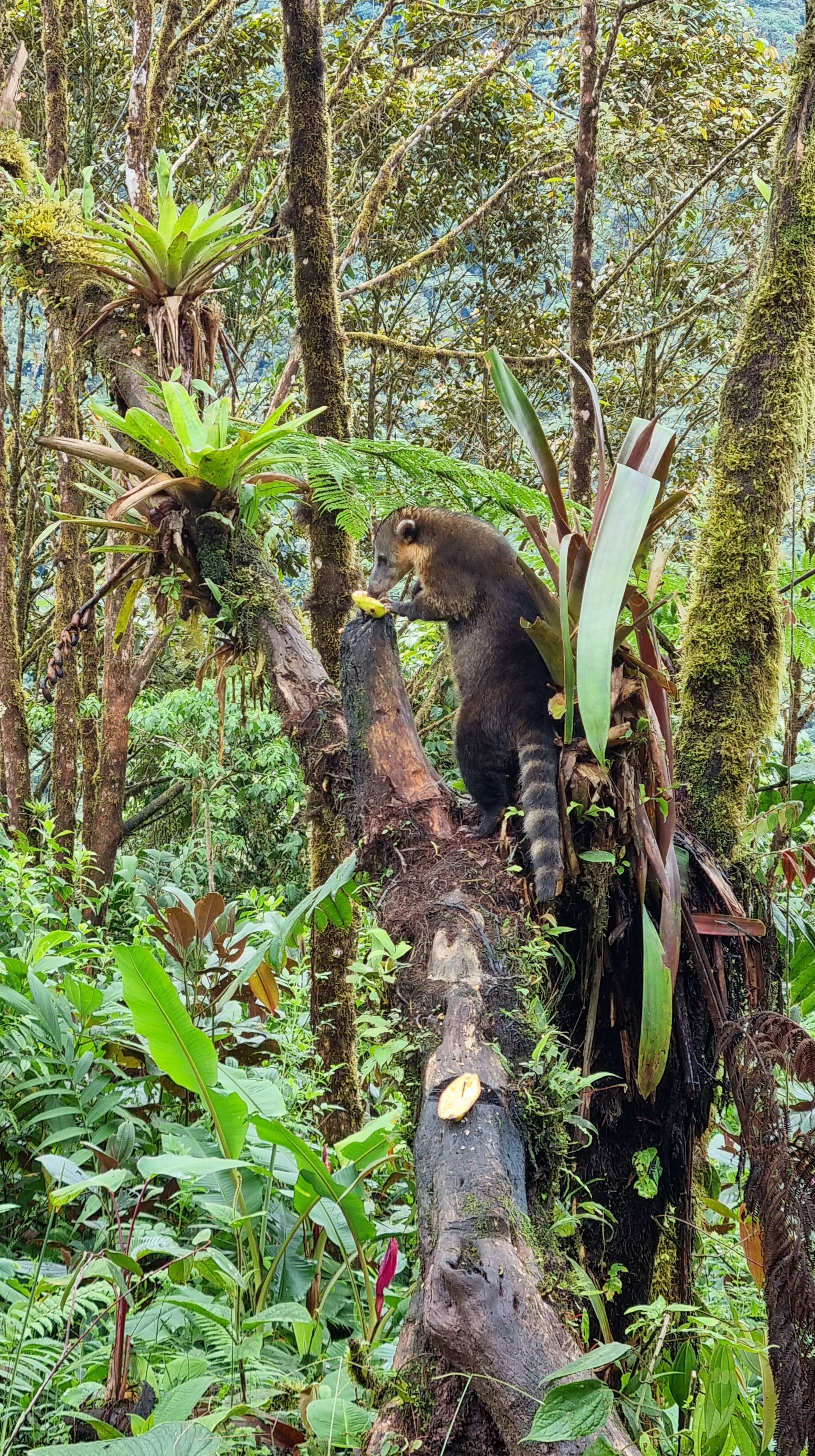As we entered the forest the scenery changed to lush green trees shrouded in cloud… the forest lived up to its name. But every now and again we saw a shimmering tree, a cecropia tree, common in this part of the world, that stands taller than the surrounding canopy and small hairs on the leaves make them appear to shimmer in the sunlight.