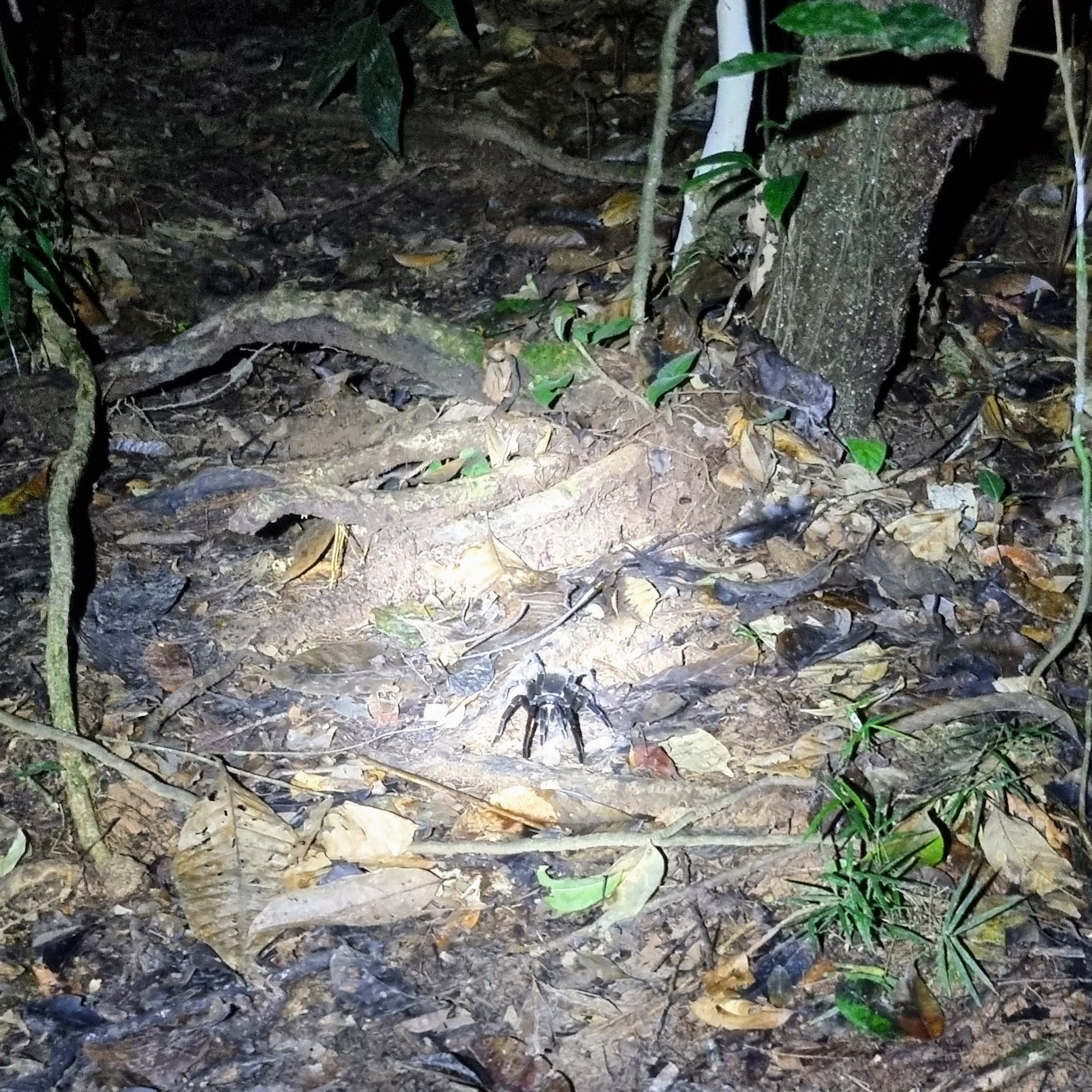 The night walk, however, was not as pleasant haha! The jungle comes completely alive at night, and I hunkered down in my jacket, zipped all the way up, with my hood up and everything, to protect from all the biting insects (and to feel some sense of security against all the spiders!). For those who know me, you will know I am not the biggest fan of spiders – although I have got a lot better over the years and a lot more tolerant. Well on this walk, I must have seen HUNDREDS of spiders, and I am not exaggerating… I could not get many good photos in the lighting, and also, I was far too distracted by how big they all were to take too many photos, I was tying to watch where I stepped. Honestly, everywhere you looked was a massive spider on the hunt! We also saw a few poisonous toads, some whip scorpians (which are not really spiders at all, but look like them), stick insects, and loads of other bugs. My heart rate was through the roof haha, but I survived, and I must admit, it was quite cool.