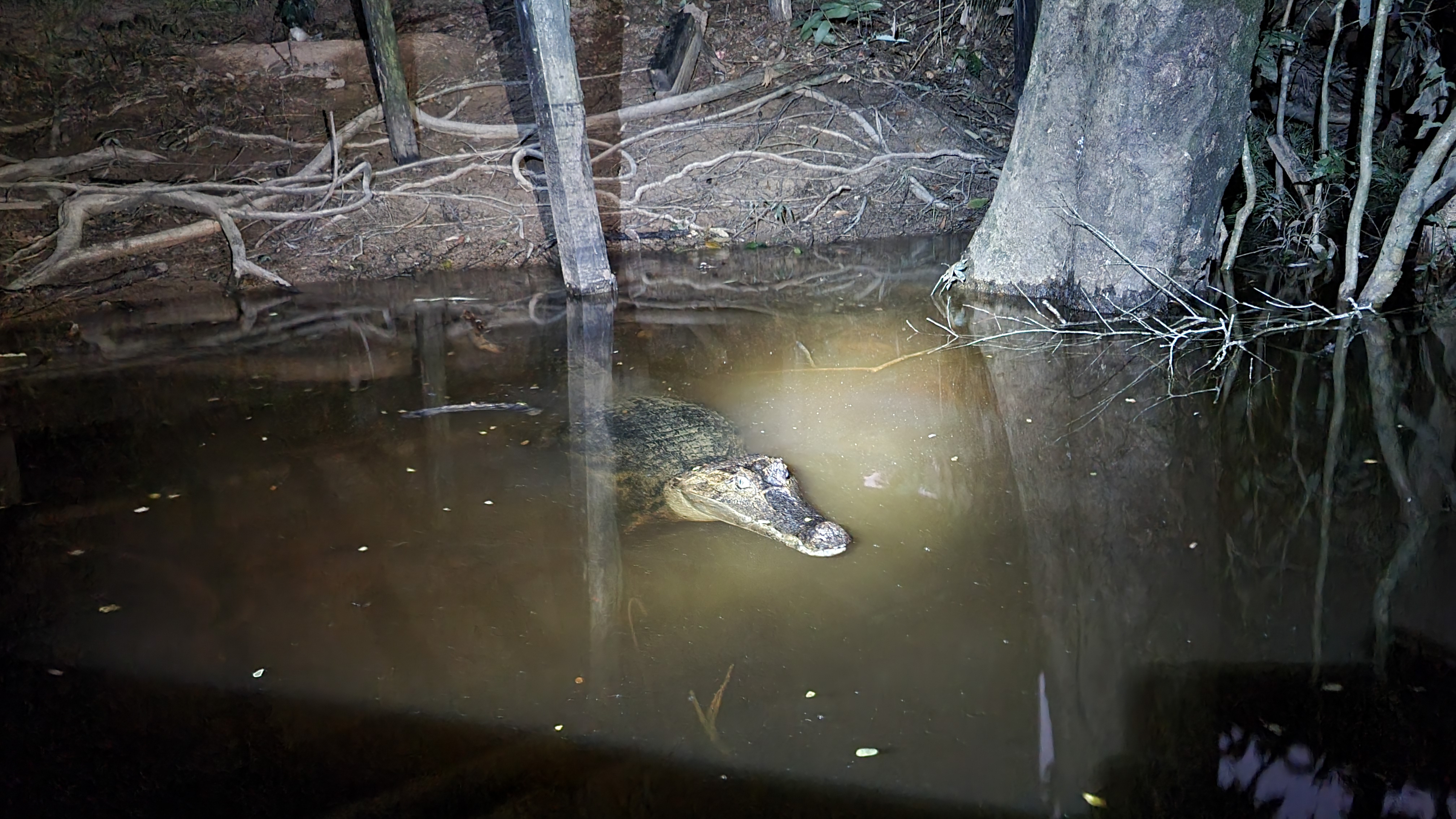 After admiring the stars for a little, we then started the journey back to the lodge in absolute darkness. However, we were told to use our torches to scan the riverbanks and surface waters for eyes… caiman eyes are reflective, so if you catch it right, they light up like little beacons. We spotted quite a few caiman, both black (the larger variety) and white or ‘spectacled’ caiman (the smaller variety). But to be honest, they were both big and I wouldn’t have wanted to be in the water with either!! haha