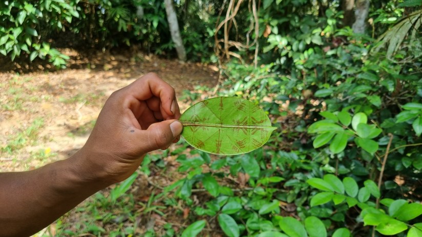 This leaf produces a red colour when damaged and is used as a dye primarily, but he also said sometimes to write on! Or create cool patterns like this.