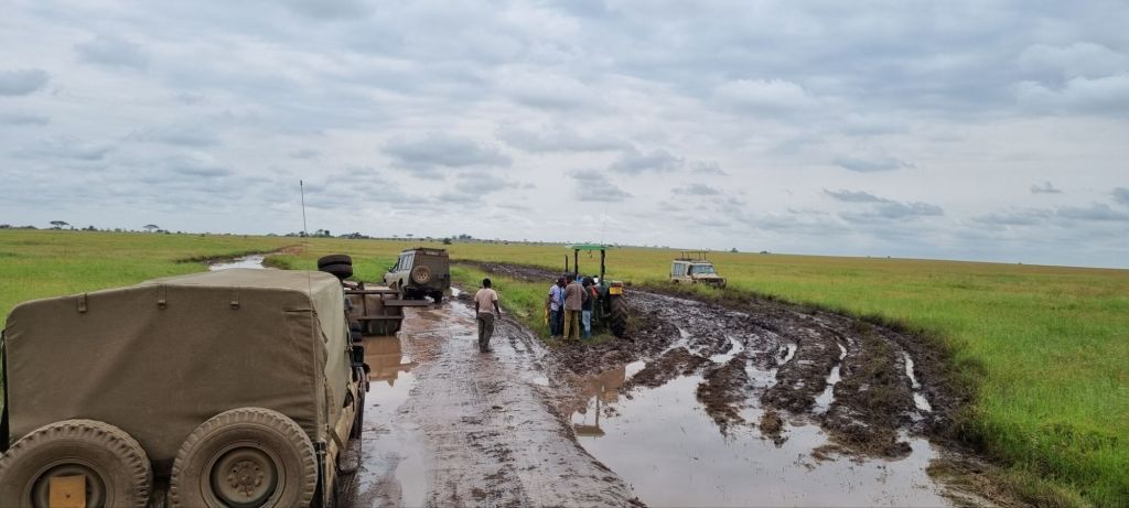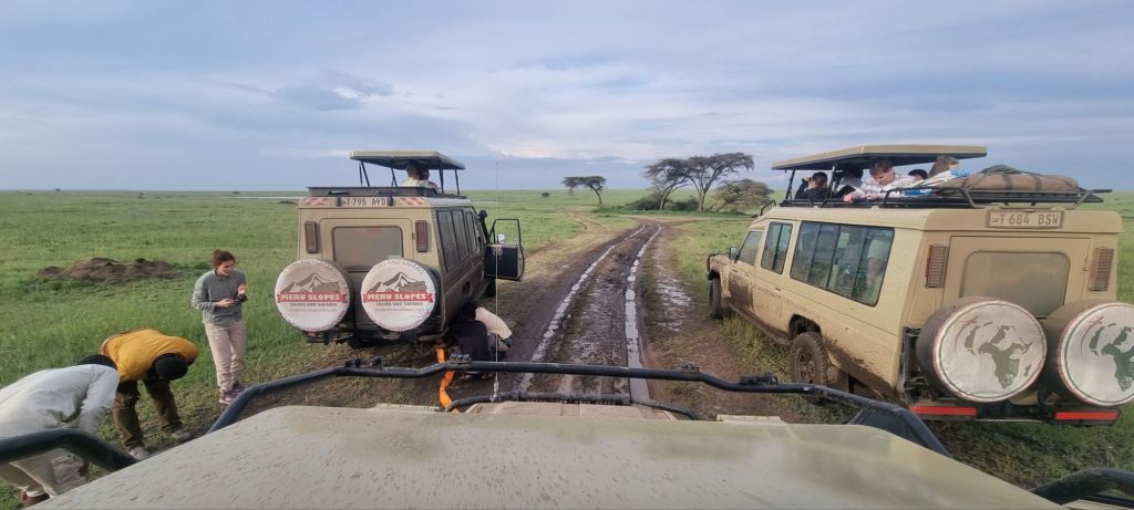 The “roads” (more like dirt tracks) were very muddy, and several of our convoy got stuck multiple times. We spent more time helping other cars get out of the mud than we did looking for animals, which was frustrating. It was then our time to get stuck! It was mad because we didn’t see any other safari vehicles getting stuck, just our convoy of about 10 jeeps. It made us think they didn’t really know what they were doing. But luckily, we were prepared for it and everyone had a heavy duty rope for towing free!