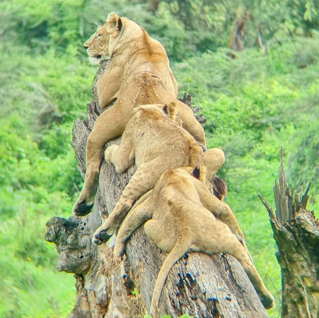 From the wetlands of Ngorogoro, we moved towards the forest, which was dense and green, more like a jungle. And here we saw some tree climbing lions… Well… Just about, they were more like tree sleeping lions haha