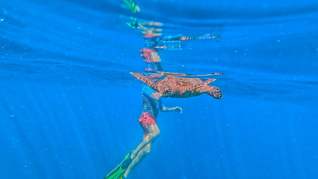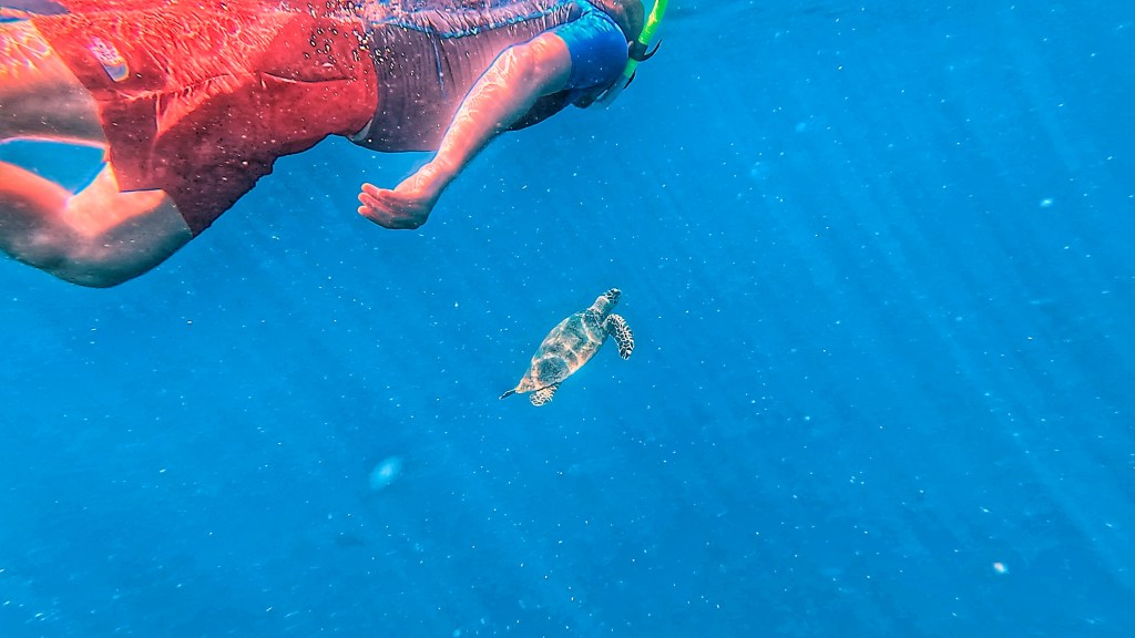 We saw a turtle, who, just as we passed it, decided to come up for air right in-between us. I almost ran into it with the current. It stayed on the surface for a long time just chilling with us peacefully, until someone on our boat spotted it and alerted the others in our group. As the group splashed over to us to catch a glimpse, the turtle scarpered quickly into the depths. But we’d had some nice time with it, so it wasn’t too bad. Poor thing.