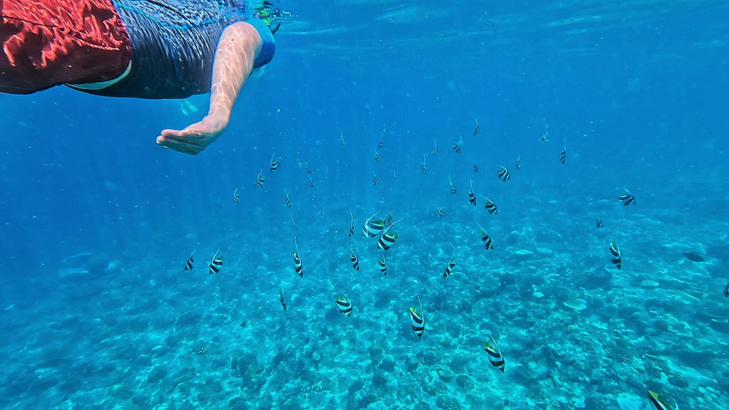 This might have been boring, except for the stunning vistas, the lush green forests of the islands, sandbanks and of course the crystal clear turquoise water. Dave saw some dolphins jumping out of the water (I missed them ☹️), and I spotted a few turtles bobbing at the surface. The water was so clear, you could see the reef and the colourful fishes just from the boat. And we saw countless flying fish!