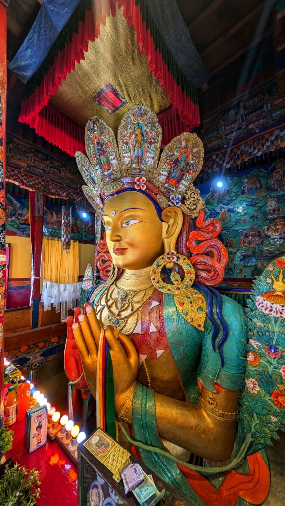 We stopped on the road back to Leh to visit Thiksey monastery, which is probably the most impressive in the region, with it’s long row of prayer wheels up the mountain. There is also another giant buddha inside the temple.