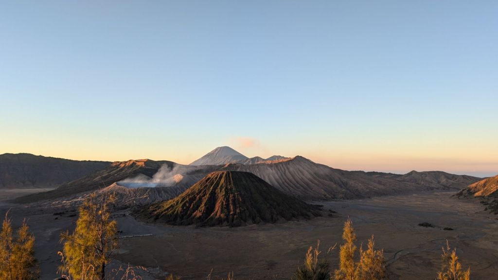 Semeru in the back, the tallest, Bromo to the left, the open crater and Batok at the front