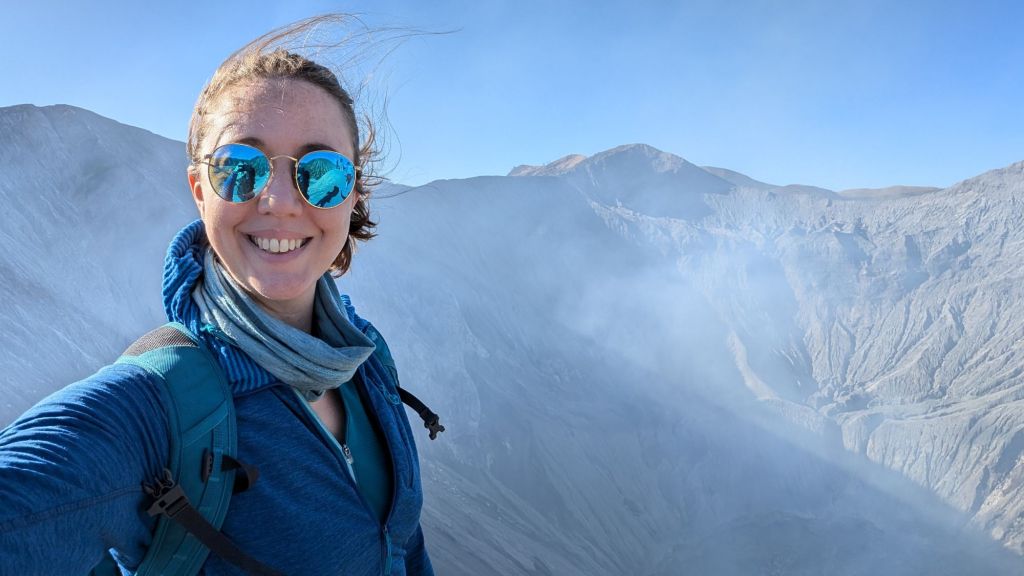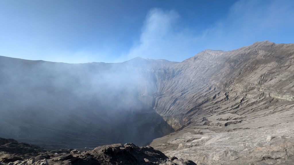 It smelled of hydrogen sulphide at the top, but nowhere near as bad as Sibayak, and just moving off to the side got a breeze of fresh air.