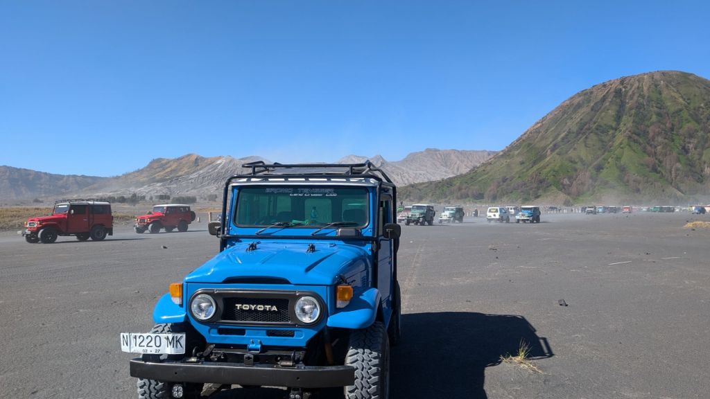 The drive from Probolinggo to the village of Cemoro Lawang took about 1.5 hours, and then there we changed our car to a jeep. The jeep continued up into the national park along winding roads, but this part of the journey was slow because of the traffic. We had heard that weekends were not the best time to visit, because there are lots of domestic tourists who come from all over Java to hike at the weekend, but we had no choice and didn’t want to waste more time. Actually it wasn’t that bad, it took us about another 1.5 hours to get to a parking spot near the viewpoint of Penanjakan hill.