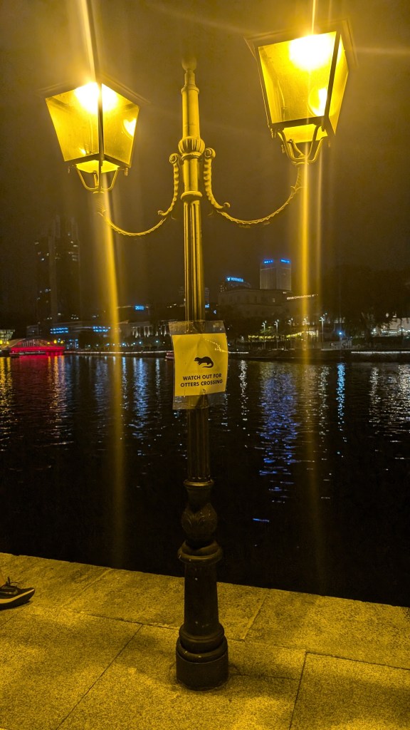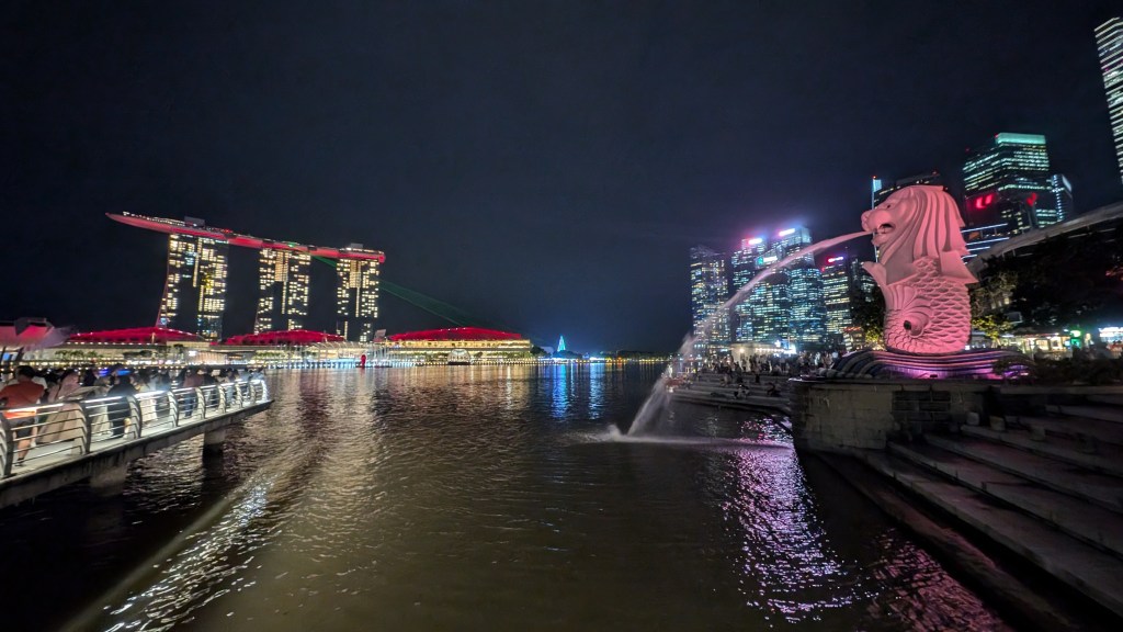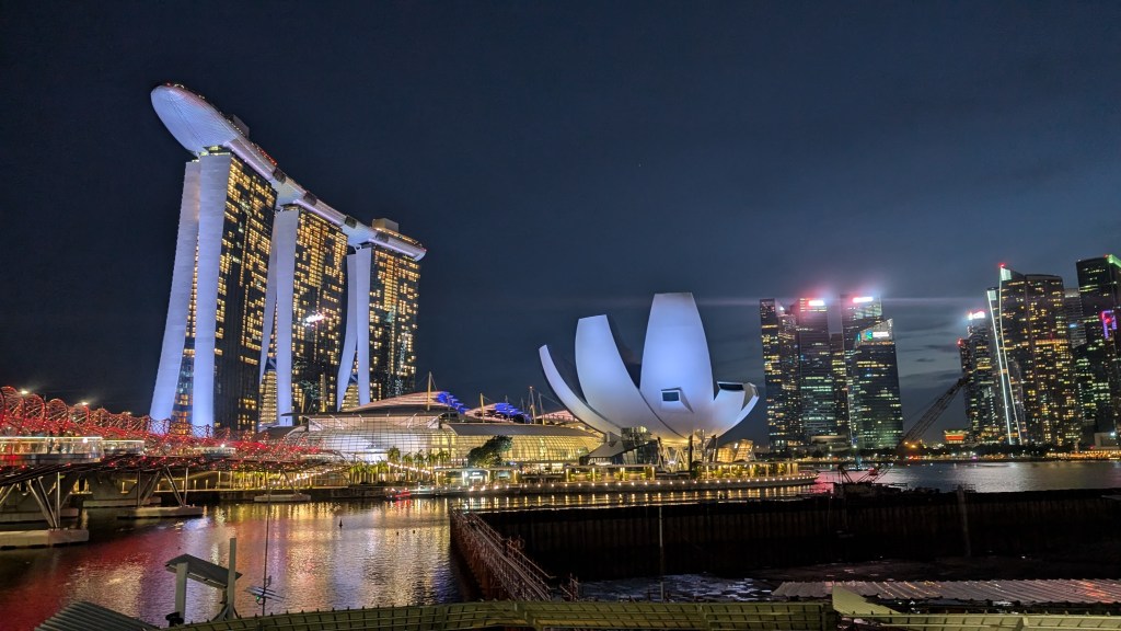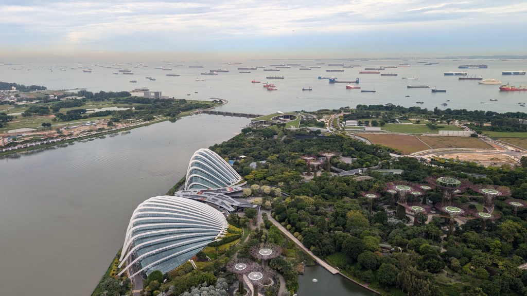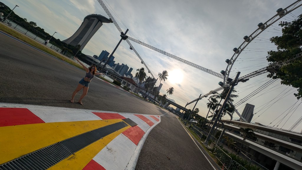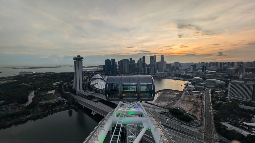 The sun was starting to set, and as you can see above, the track was right next to the Singapore Flyer, which is the huge ferris wheel here, so we decided to take a ride. It started with the “time capsule” which we thought would be a little naff, but actually it turned out to be really interesting learning about the history of Singapore. The flyer was very good, but finished before the sun set fully, so we walked back and caught the sunset by the marina instead.