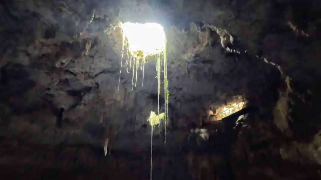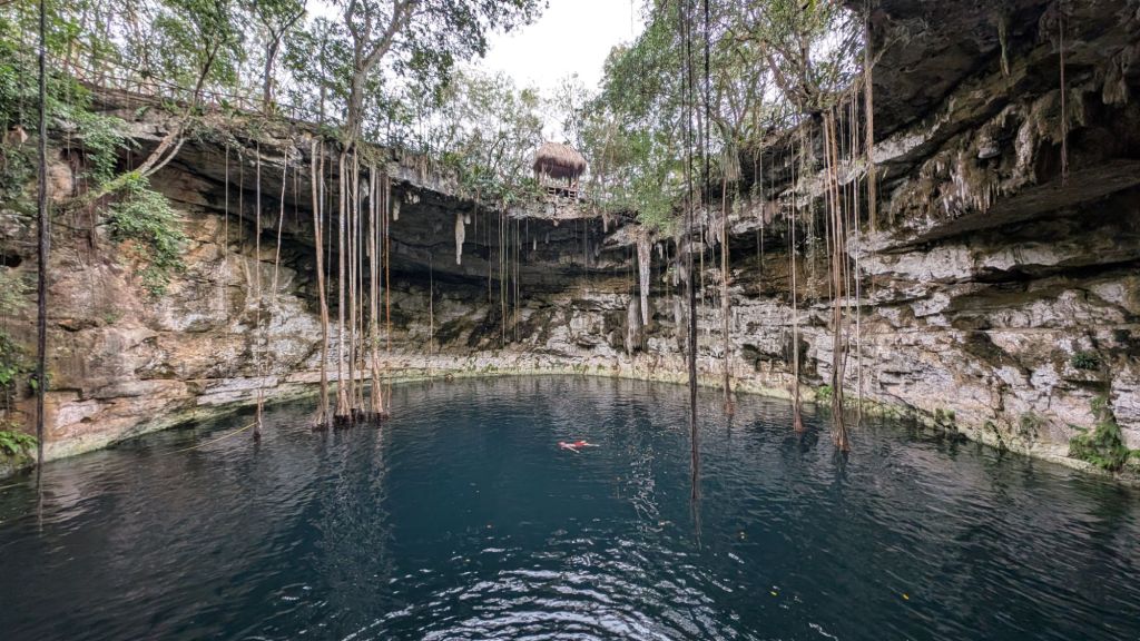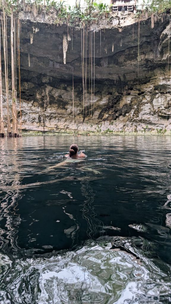 After Ek Balam, the first cenote was Chukum, a closed one, basically a cave with a couple of small openings letting in light which was cool. This cenote was very commercial and had large changing rooms, a restaurant and inside, ziplines and jumps, but given the overcast rainy day, the water was not super appealing and was pretty cold actually!!! I got in and out almost immediately, but Dave did a few ziplines!