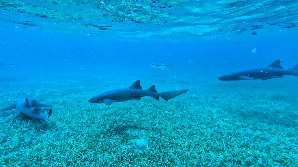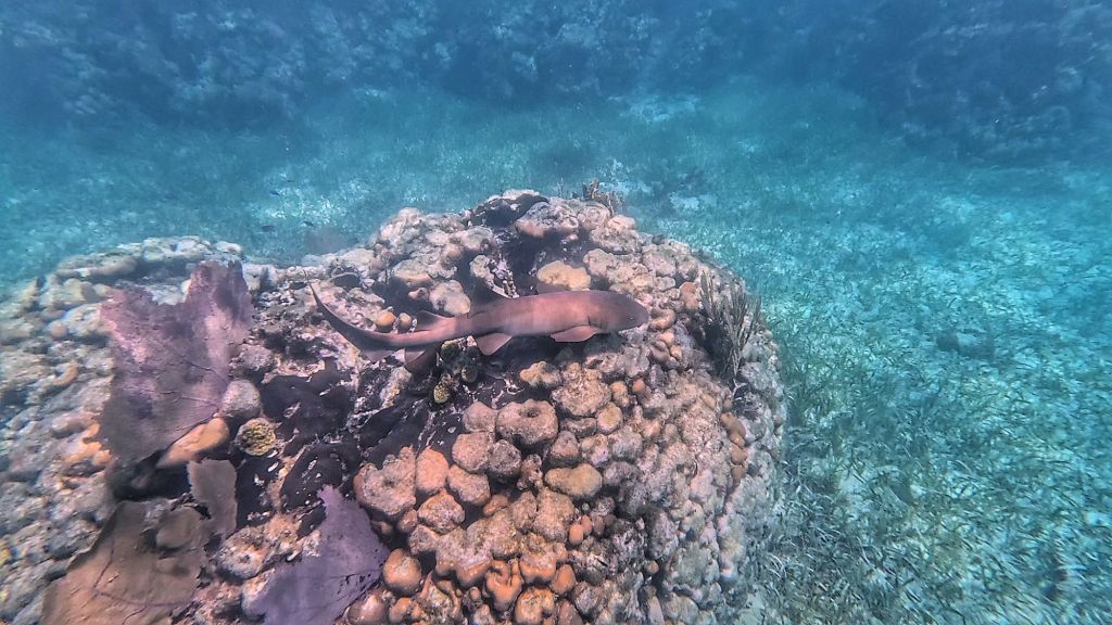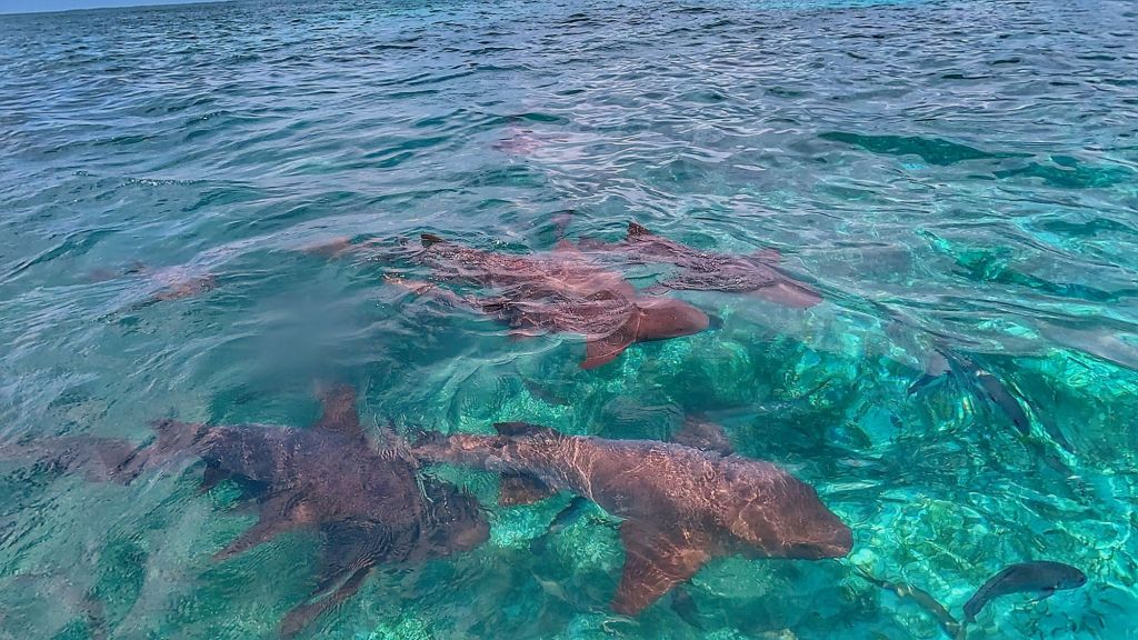 Then it was shark and ray alley… As soon as we pulled up in the region TONNES of sharks were circling us. Our skipper started playing the jaws theme tune 🤣 and genuinely I was thinking, what the hell are we doing! But nurse sharks are just like big puppies, they are gentle giants and not interested in humans at all. They actually eat the huge conch you get here, which are in the big shells scattering this whole region, they latch on and actually suck out the conch, so they don’t even really have teeth!! Haha. But still, getting into the water with about 20 sharks circling you is still a rush. It was so cool!!