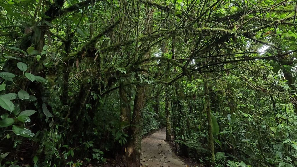 But even without too many wildlife sightings, the forest was still magical, as all cloud forests are. There’s something really mystical about them. A lot of the paths are dark, totally shaded, and between the trees is a dense covering of cloud and mist. And everywhere you look is green, there’s basically no bark on show at all, as every inch of the trees is covered in moss, vines, orchids, bromeliads, and air plants or pothos plants. The only differing colours being the orchid flowers and the deep red bromeliads.