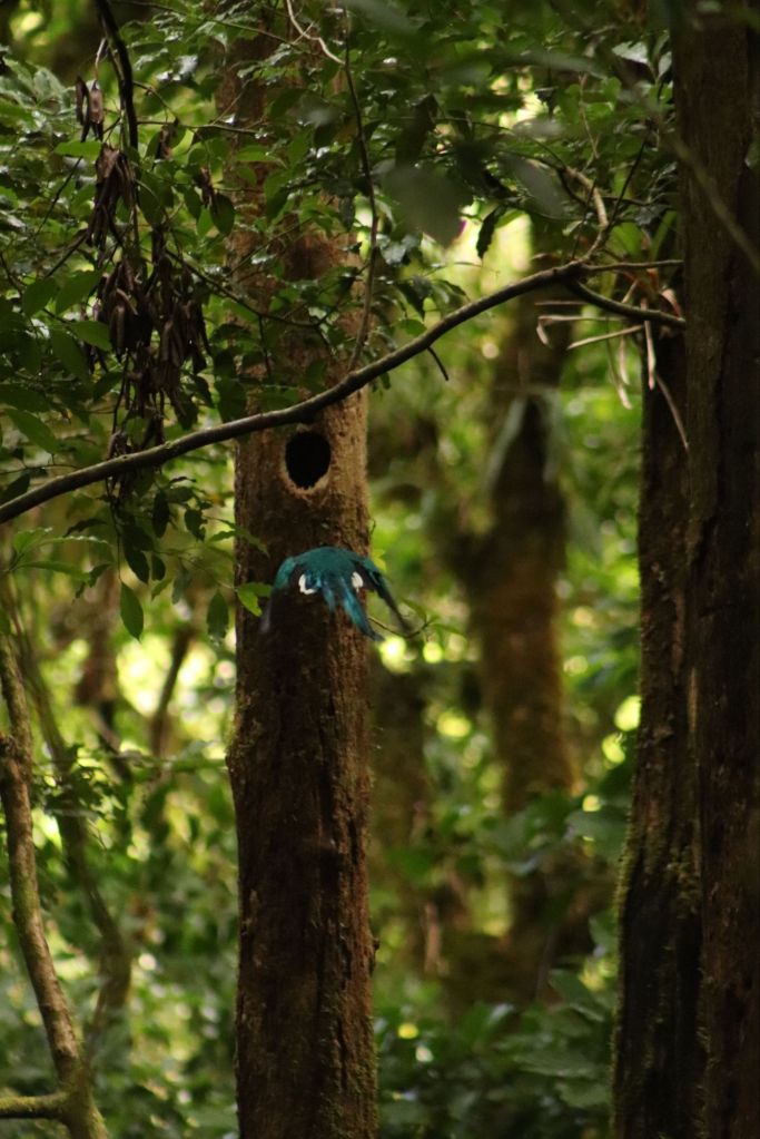 We waited probably 3 minutes and then the male quetzal appeared 😊 he flew to a nearby branch and posed for us, then went off in search of food and we lost him. We waited for another 5 minutes and he came back to the nest, disappearing into the hole!