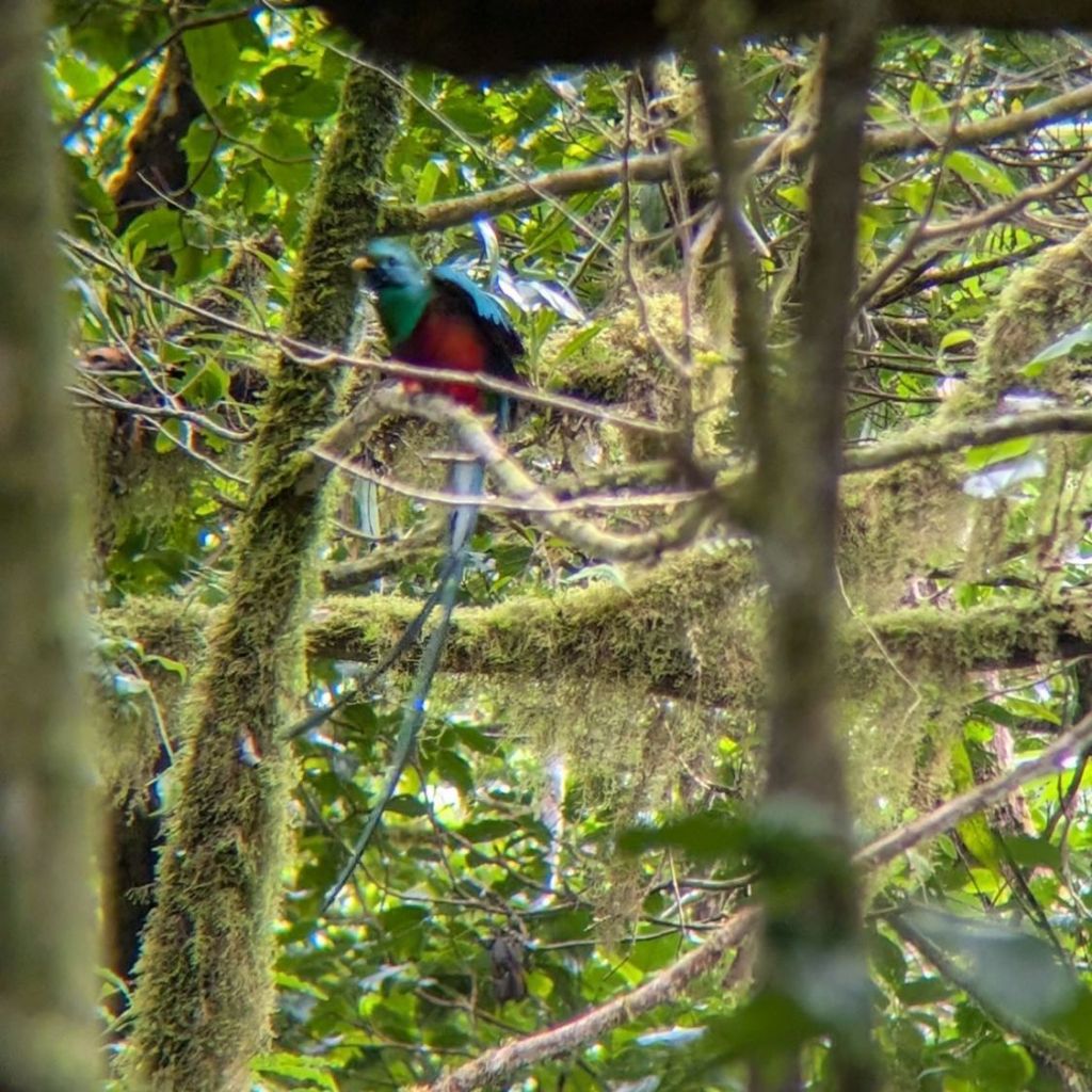 The walk was about 6 hours before we finally reached the start again, and we quickly headed back to the Quetzal nest, but there were now LOADS of people gathered here staring at the nest, some talking loudly, others with their mega cameras set up on tripods pointing at the nest… We waited a few minutes and decided to continue along the path away from the masses. We walked about 200m further along the path and away from all the crowds til we couldn’t hear them any more… Then…. I saw the male quetzal in the trees. Perched not too far from the path, perfectly visible, and we had him all to ourselves ☺️. It was INCREDIBLE, and I couldn’t believe I’d spotted him. We stood and watched him in silence for about 15 minutes whilst he preened himself and had a chill. I couldn’t have asked for a better day, it was perfect, even more so that I spotted him myself 😇