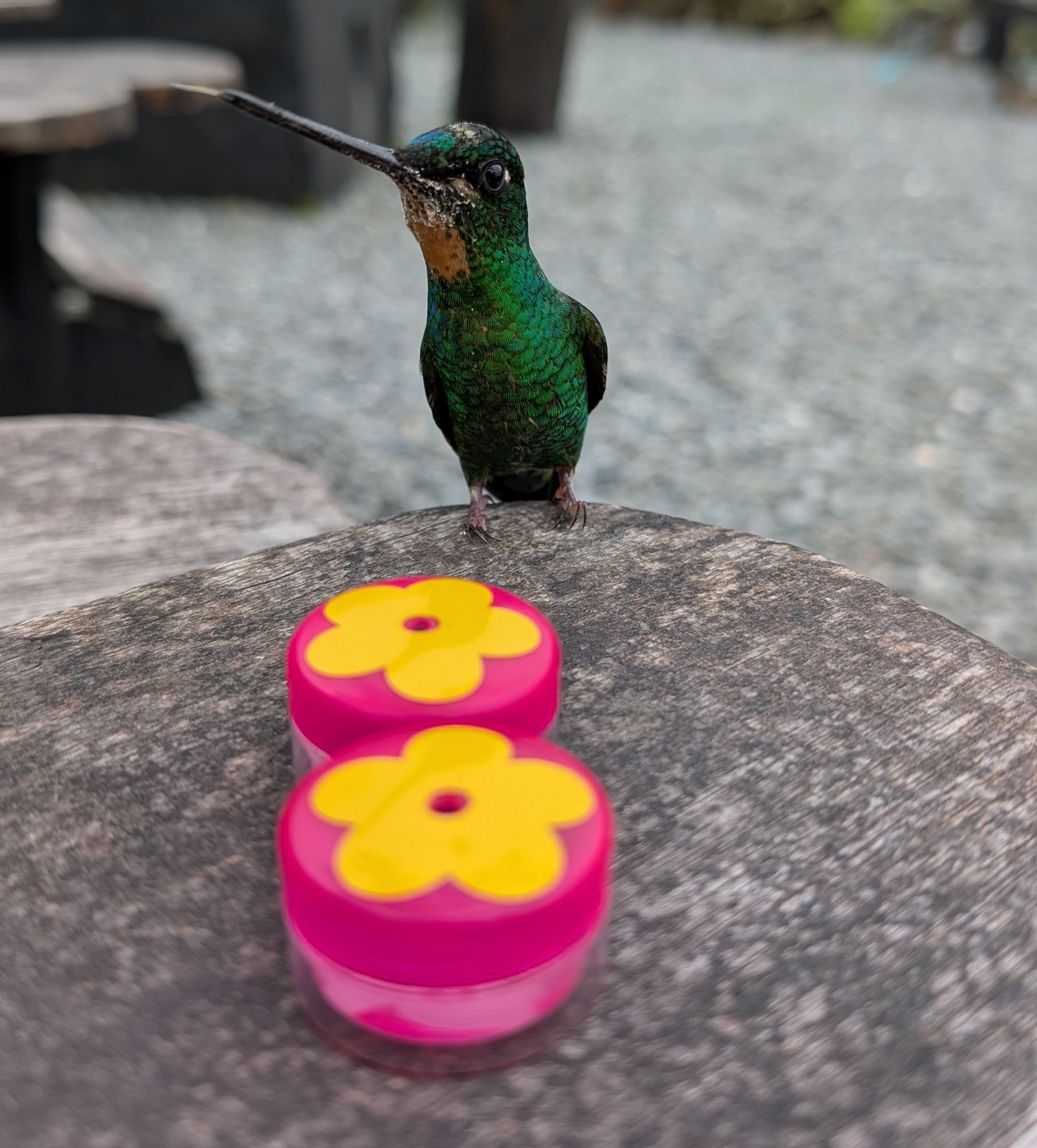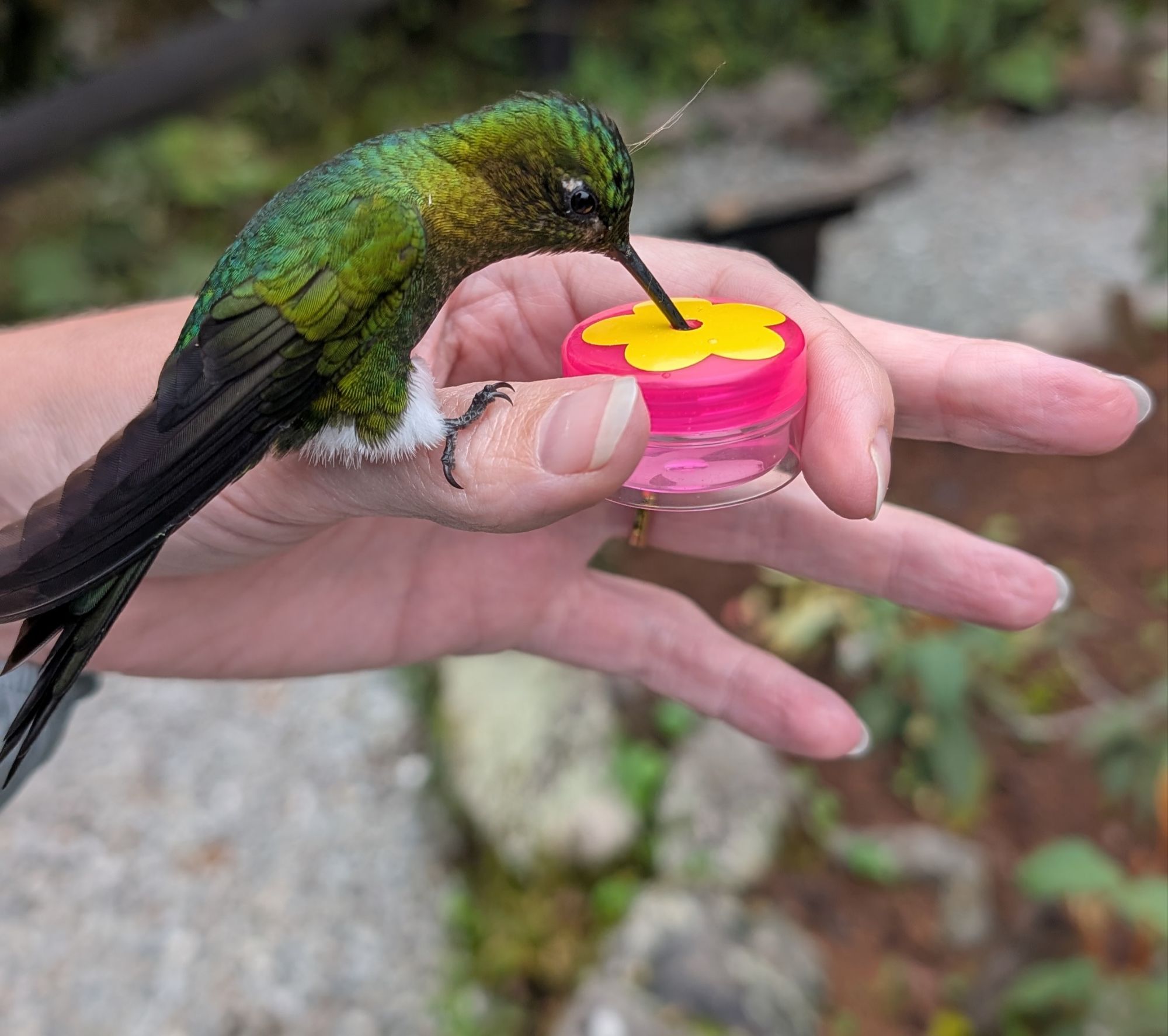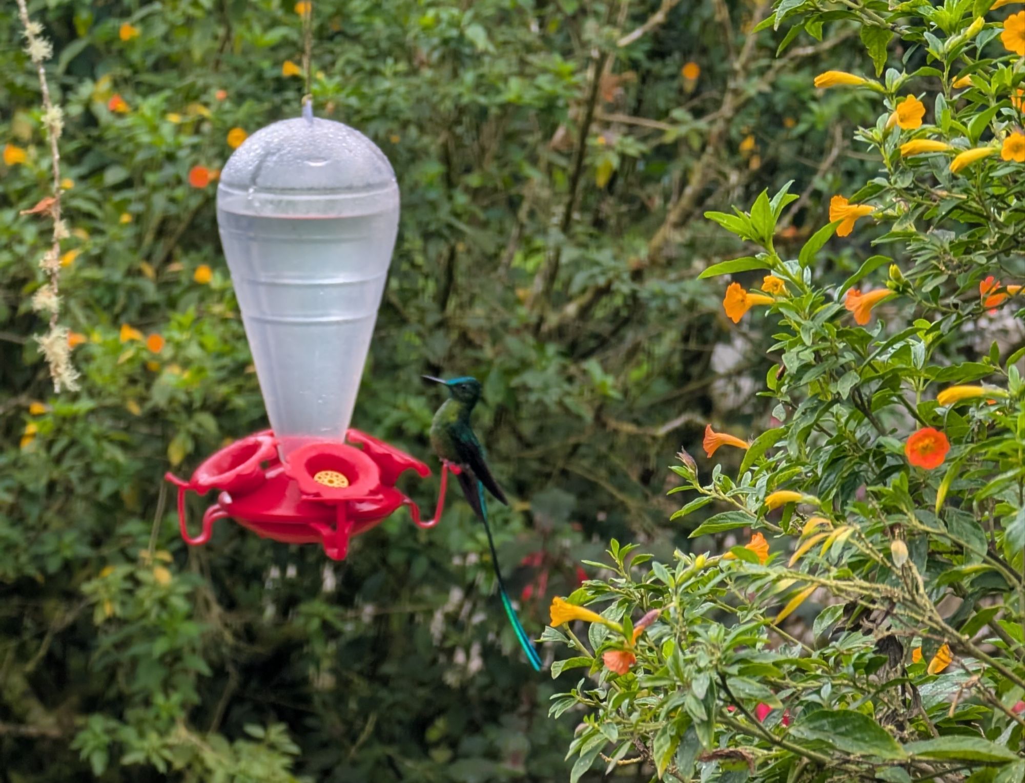 On the other side of the cabin were a few hummingbird feeders, and we saw a few new species, like an inca, and even a few majestic sylphs with their outrageously long tails and bright feathers.