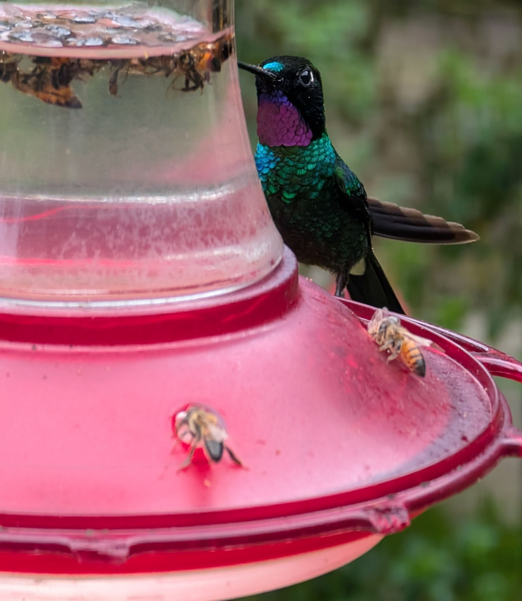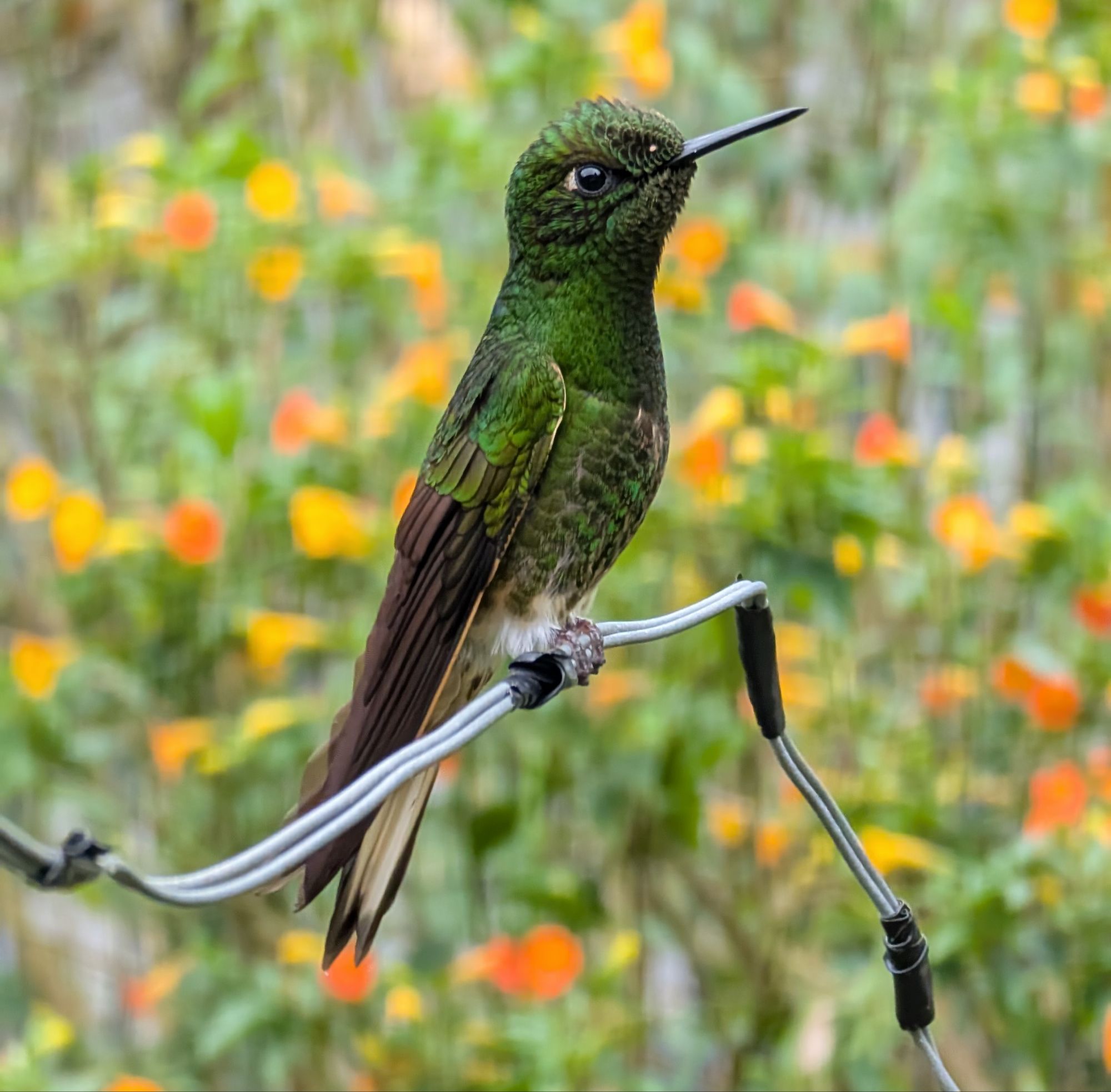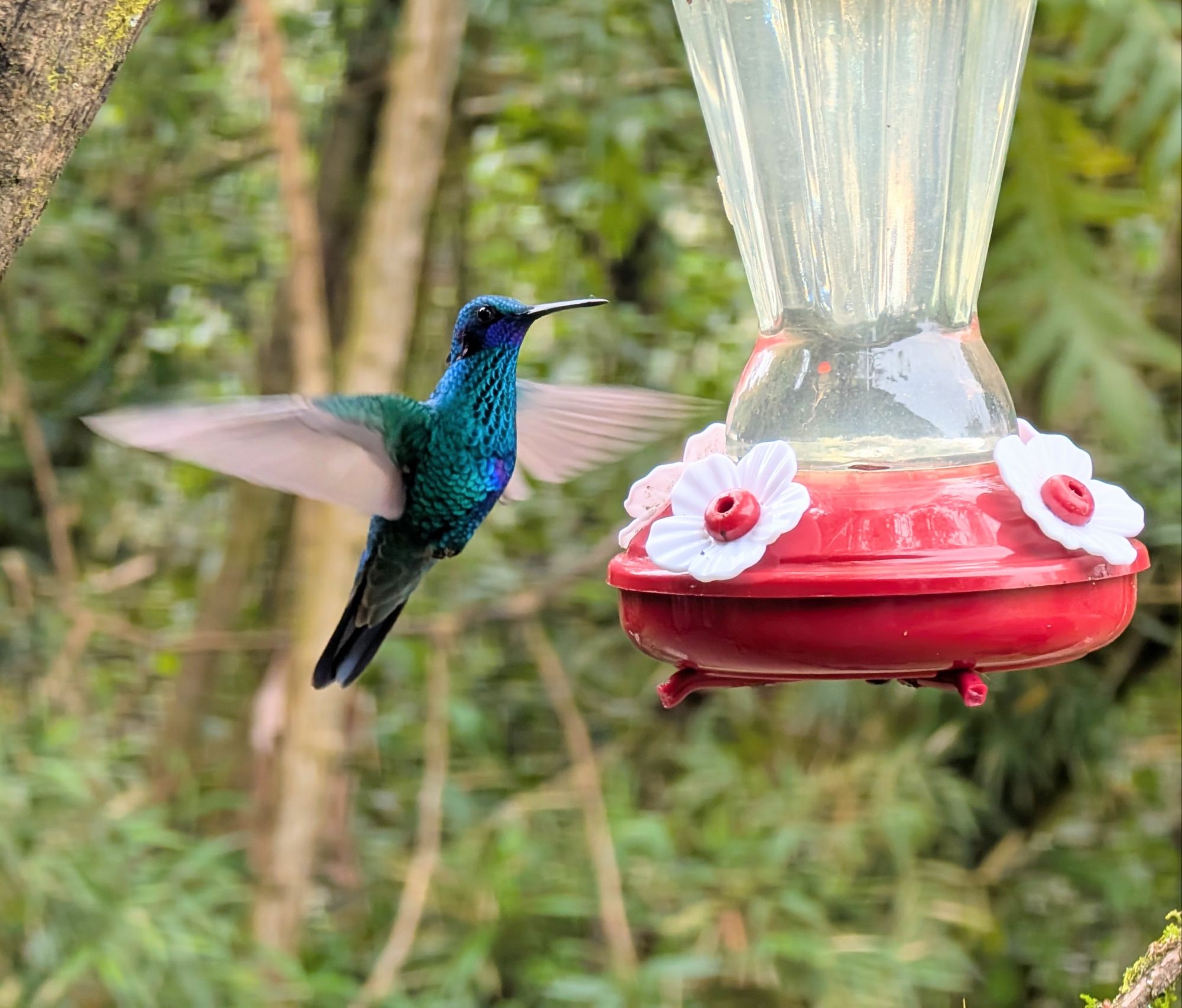 On the other side of the cabin were a few hummingbird feeders, and we saw a few new species, like an inca, and even a few majestic sylphs with their outrageously long tails and bright feathers.
