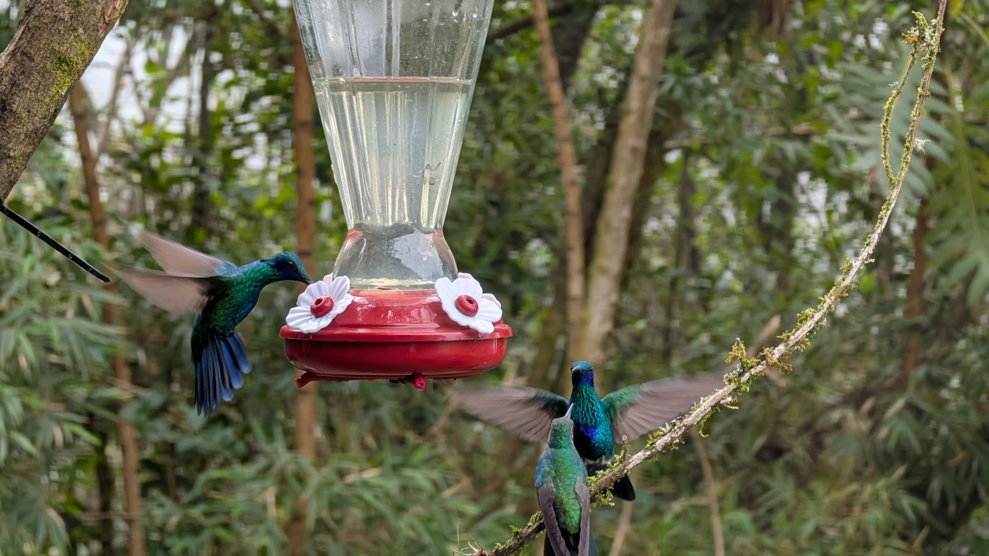 There were also quite a few tasty vegan restaurants in town, and we felt like we really could live here, it was such a nice place. And that’s not even mentioning the views from the city – since you can see Nevado del Ruiz from here and the surrounding mountains. And the hummingbirds aren’t only confined to the forests, but also found in gardens here too…